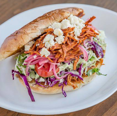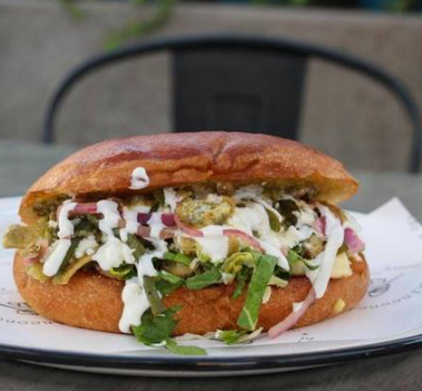 Hecho en pan regional, cochinita pibil, mix de verduras, salsa de aguacate y piña habanero.