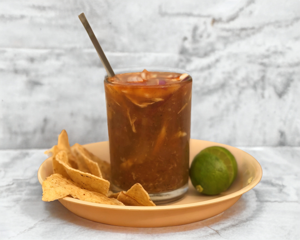 Camarón en clamato especial preparado a base de jugo de camarón, salsas negras, chile, tomate y cebolla.