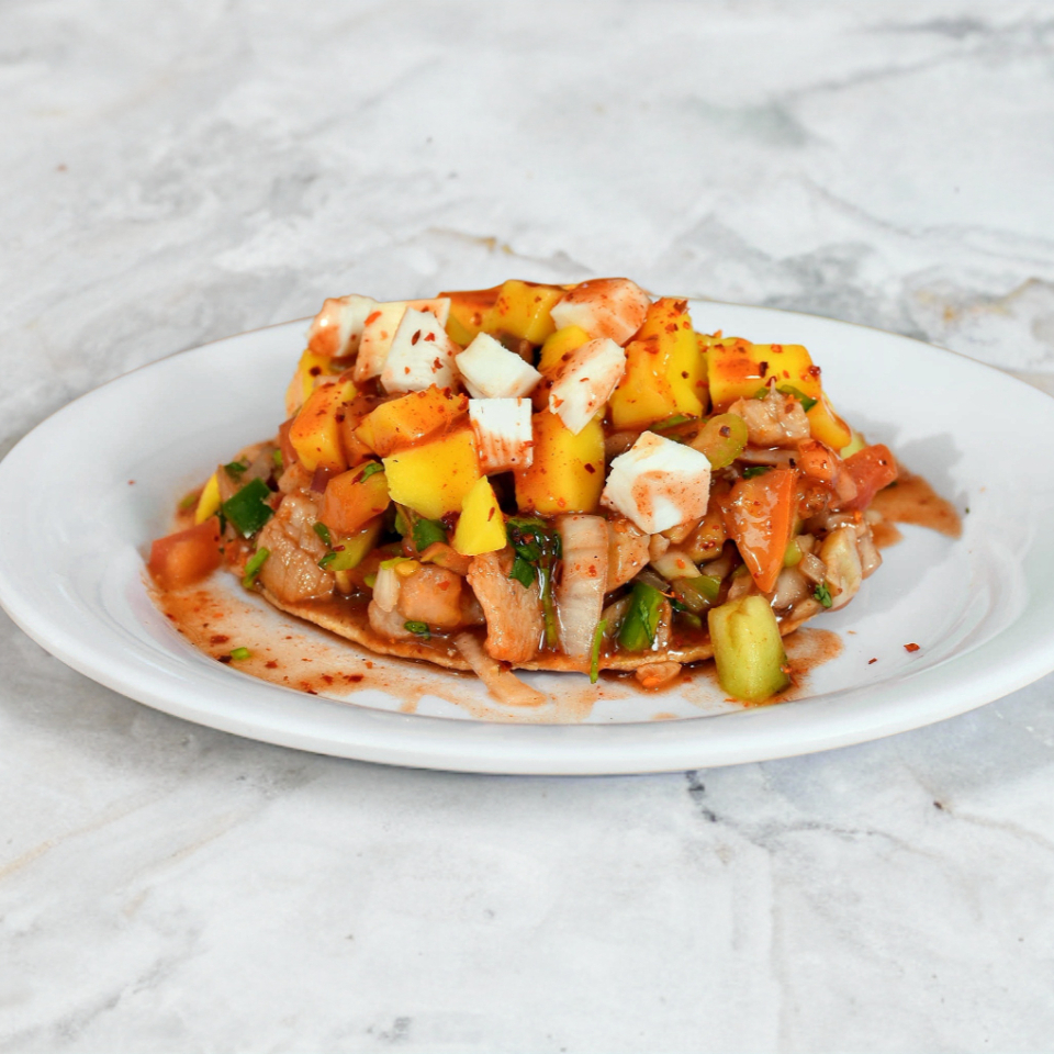 Base de ceviche de pescado, atún fresco, cebolla morada, mango fresco, aguacate y salsa especial de la casa.