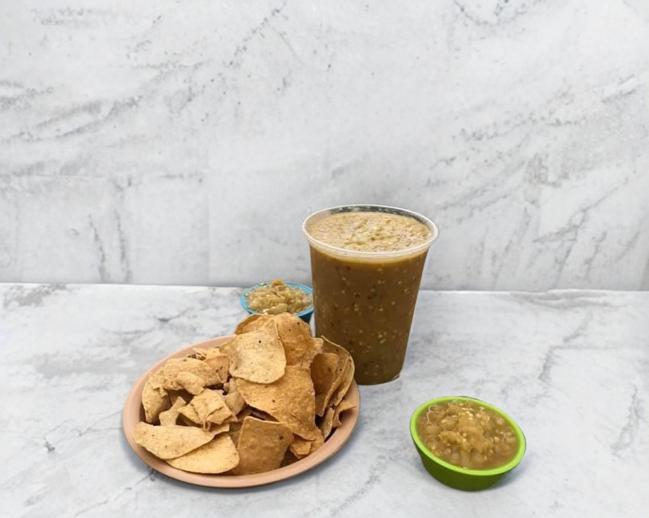 Tostitos verde o flaming hot con camarón, chile jalapeño, tomate, cebolla blanca, cebolla morada, pepino, apio, cilantro, jugo te tomate sazonado y salseado por la casa.