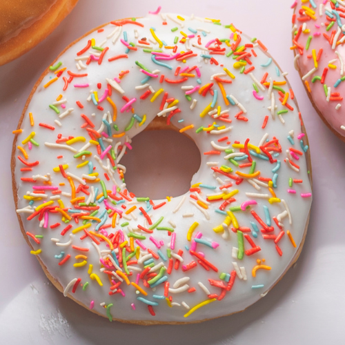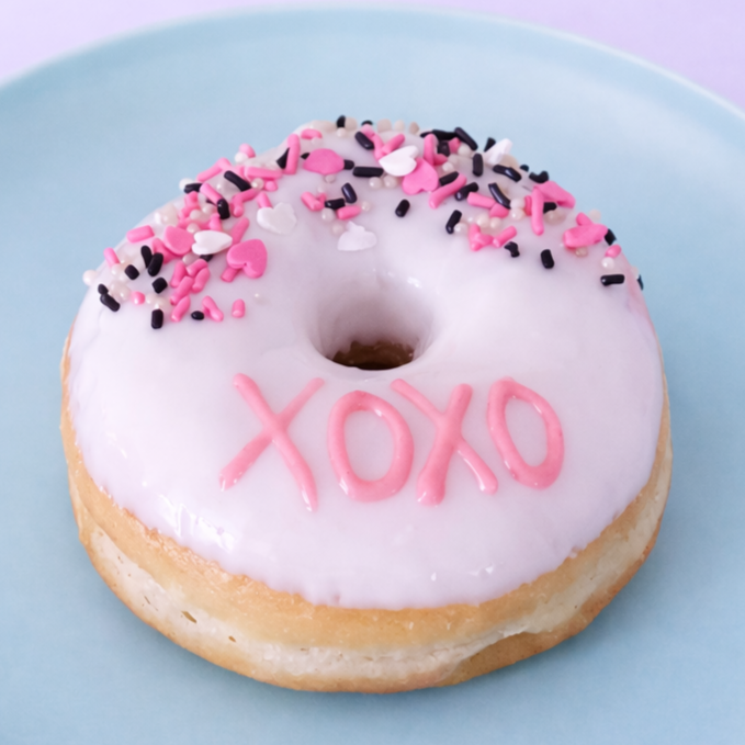 Dona de vainilla con sprinkles y detalle XOXO de fresa. Clásica y ligera.