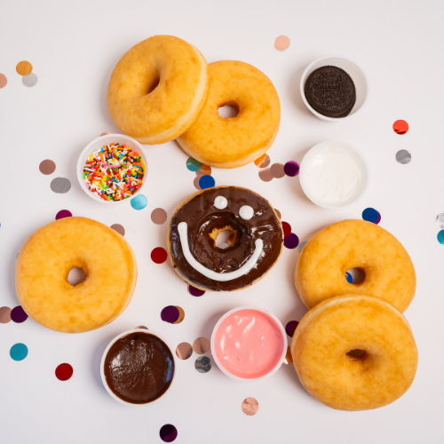 Kit para decorar 6 donas (incluye 1 dona sonriente). Crea tus propias donas deliciosas con todo lo necesario: - 5 donas sencillas para decorar - 1 dona de chocolate carita sonriente - Chispas - Oreo - Glaseado de vainilla - Glaseado de fresa - Glaseado de chocolate