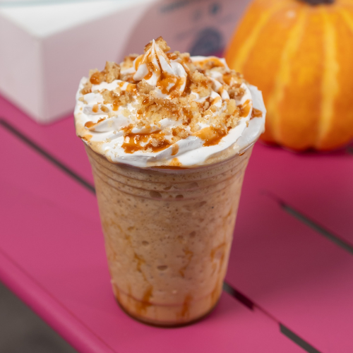 Nuestro frappe más querido del otoño. Una bebida cremosa y mezclada con el sabor especiado de calabaza, cubierta con crema batida y un toque de canela. Tamaño: 473 ml.