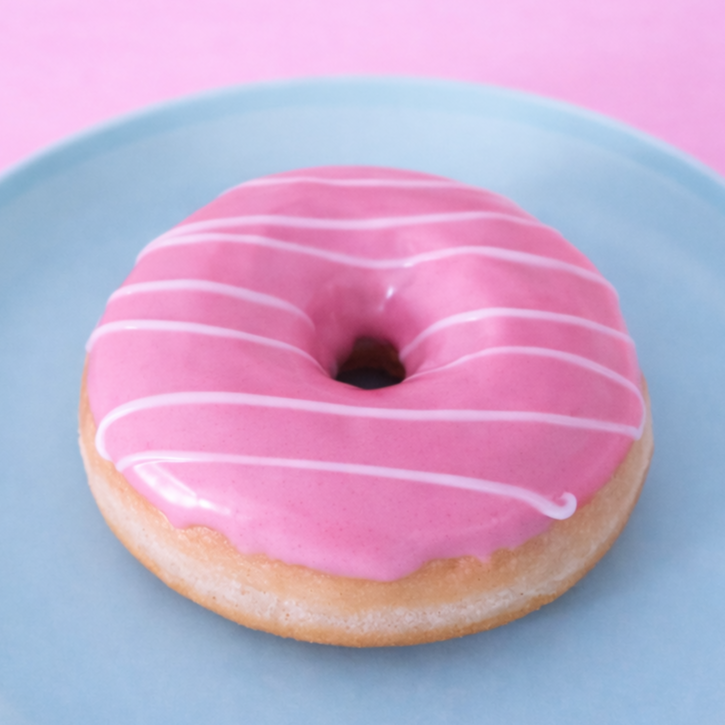 Dona con cobertura de fresa, rellena de crema bávara y un toque de vainilla.