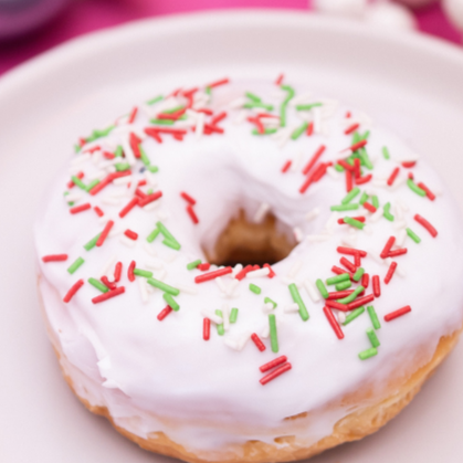 Dona con nieve y chispas. Un postre frío y dulce hecho con 1 dona glaseada y una bola de nieve.