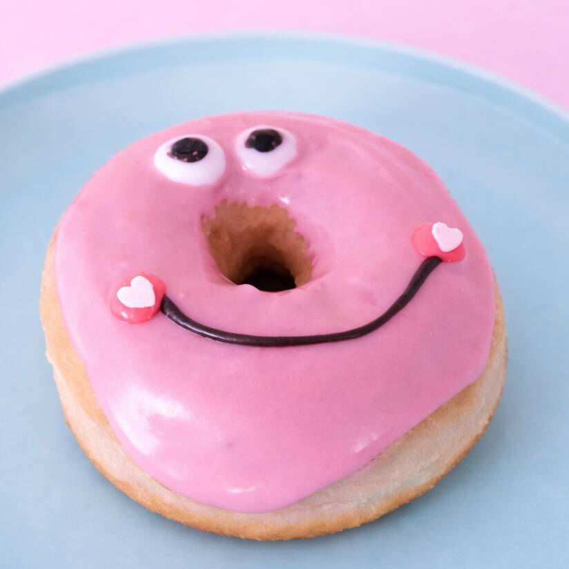 Dona de fresa decorada con detalles de chocolate y vainilla. Dulce y divertida.