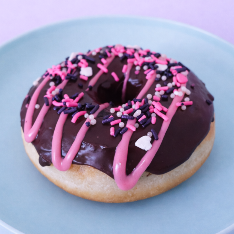 Dona cubierta de chocolate, rellena de fresa, con drizzle de fresa y sprinkles festivos.