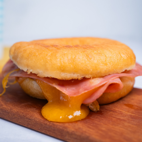 Jamón y queso cheddar en pan artesanal. Calientito, derretido y con un toque de chipotle.