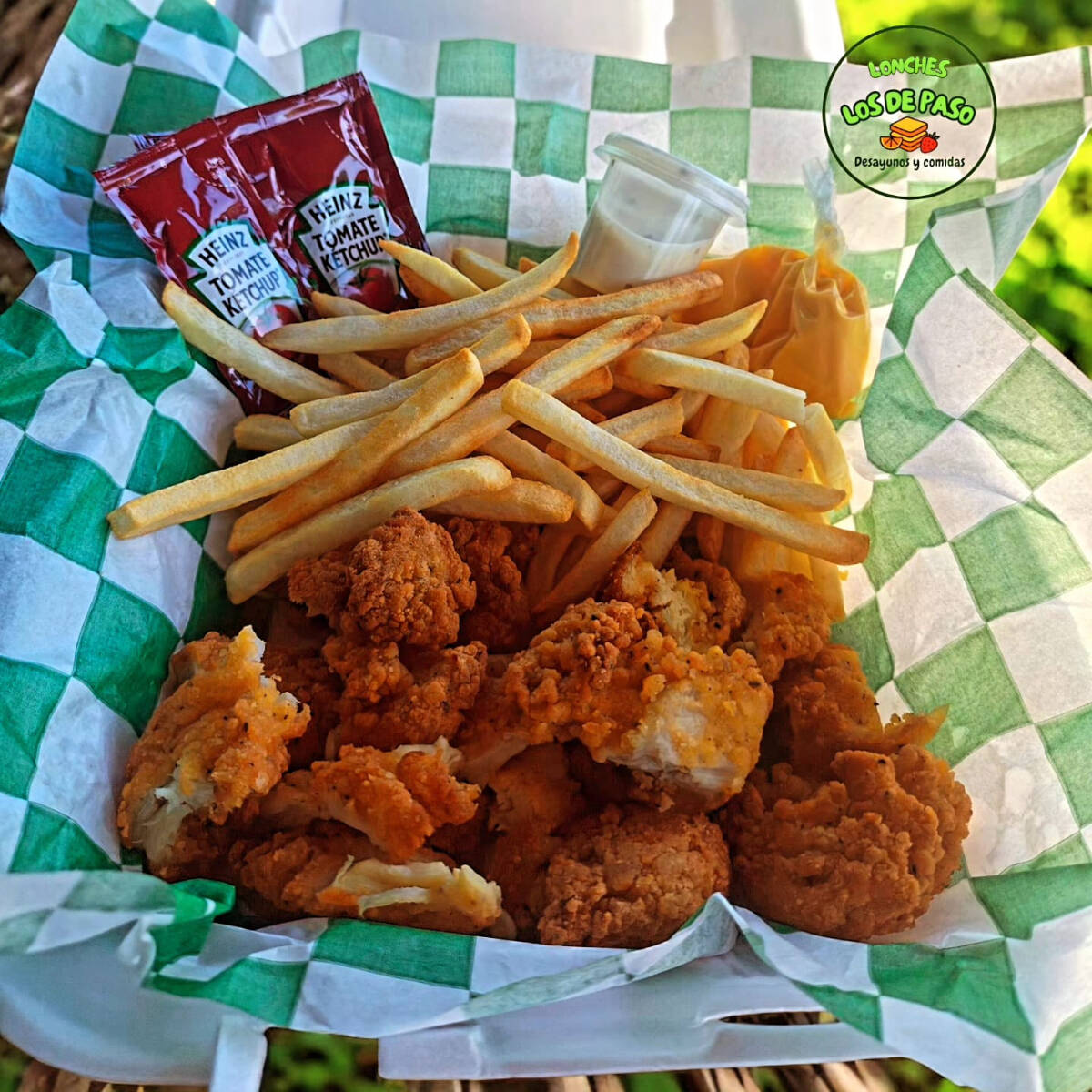 3 piezas de tender, papas a la francesa, aderezo ranch/queso amarillo/BBQ/cátsup/Búfalo