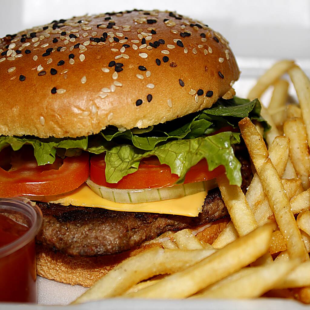 Hamburguesa con queso amarillo, lechuga, tomate, cebolla blanca y mayonesa en pan con ajonjolí. Incluye papas a la francesa, catsup, chiles jalapeños y bebida.