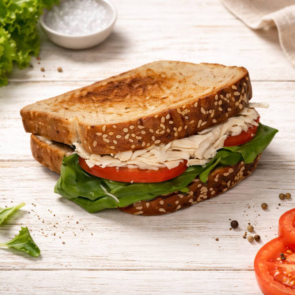 Sándwich con pechuga de pollo, lechuga fresca, tomate y mayonesa