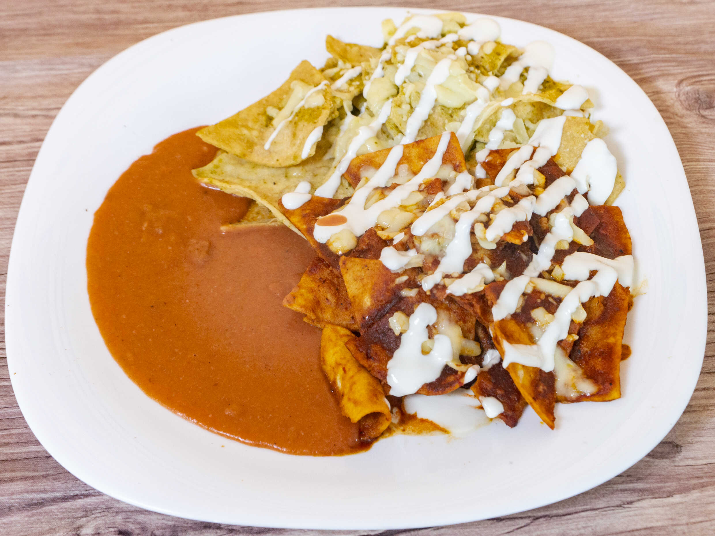Chilaquiles con salsa a elegir con queso, media crema y frijoles