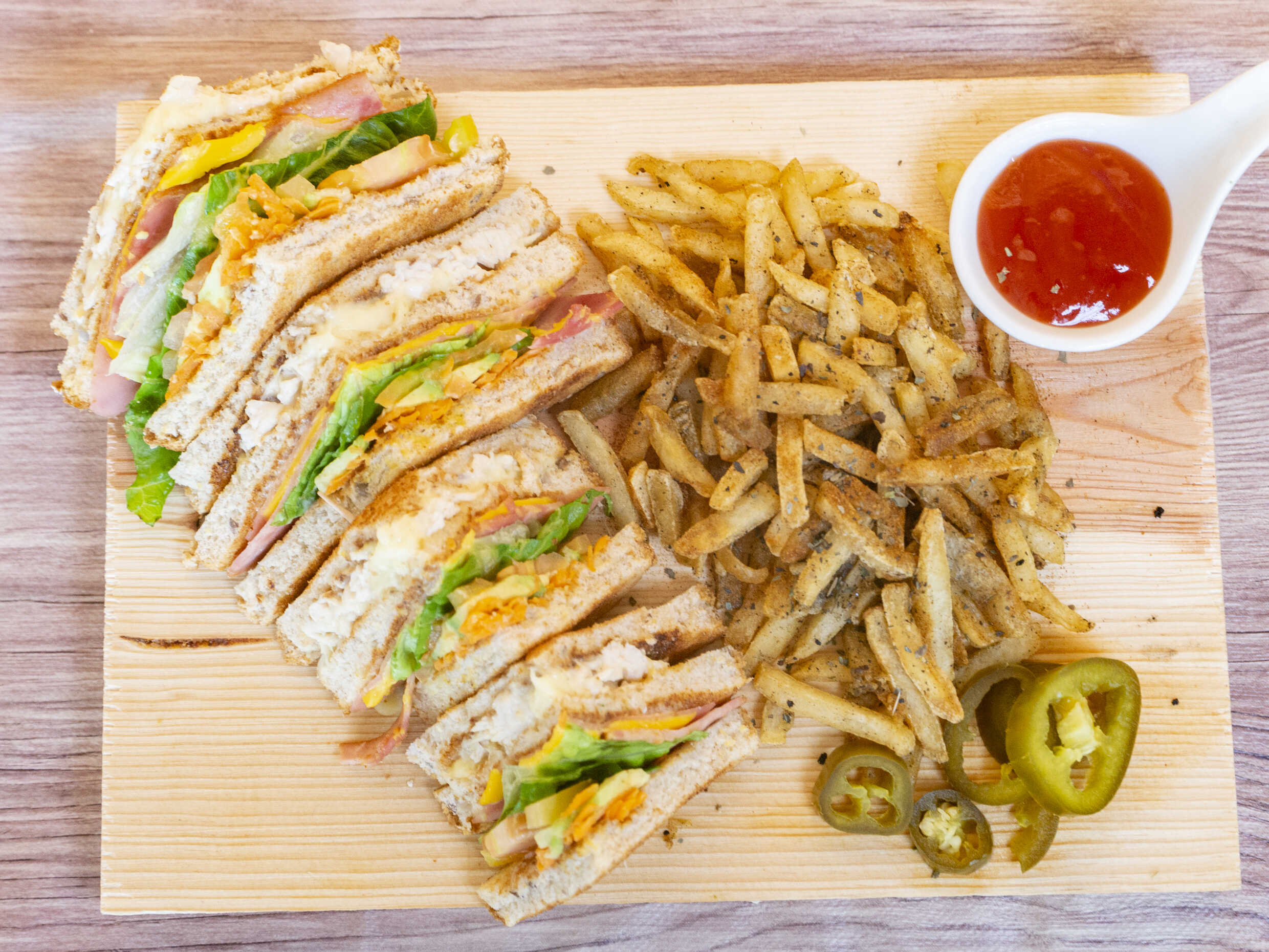 Jamon, queso americano, tomate, aguacate, acompañada de aderezo chipotle y jalapeños.