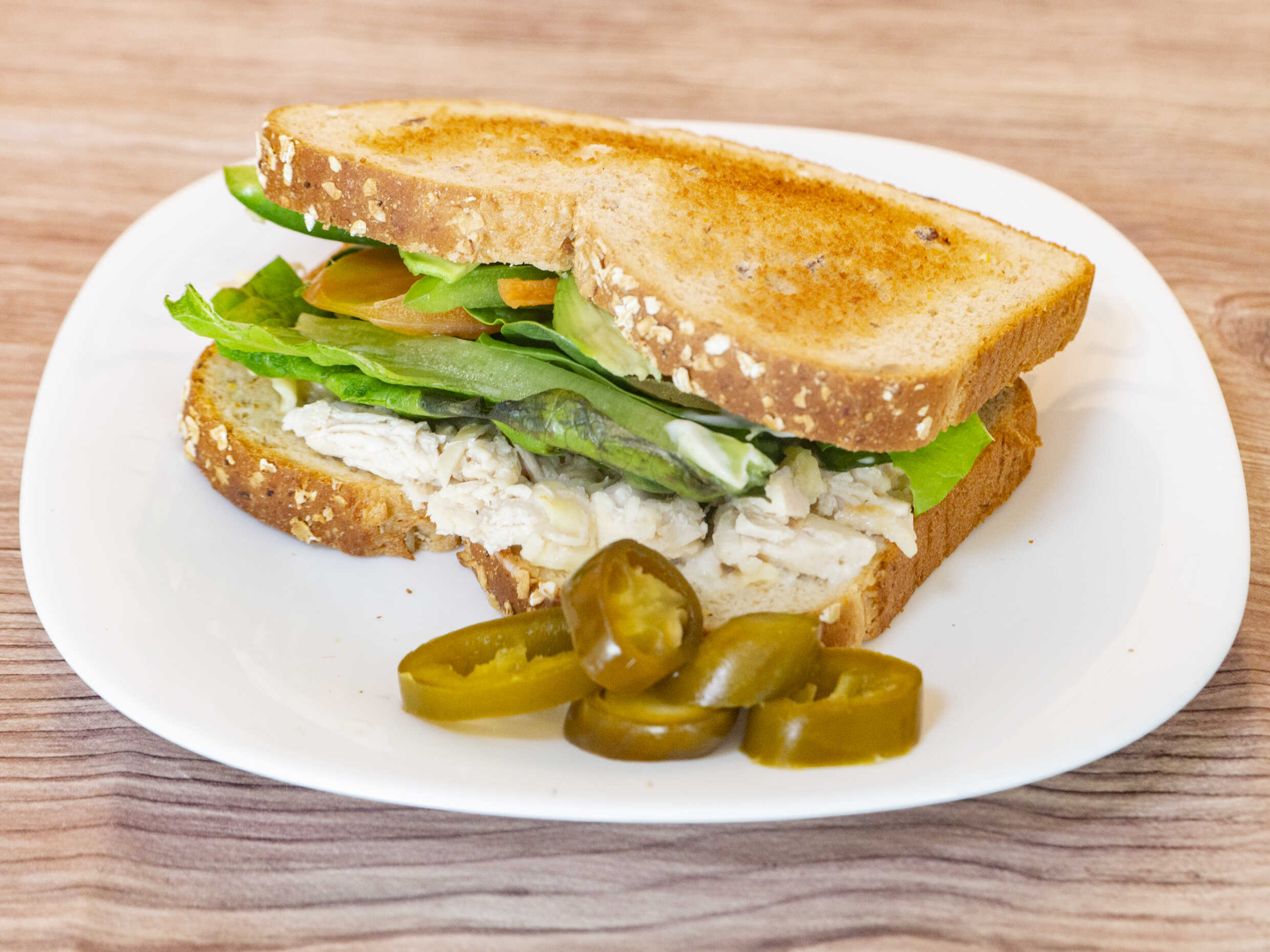 Sándwich con lechuga, zanahoria, aguacate, queso Chihuahua y acompañado con jalapeños.
