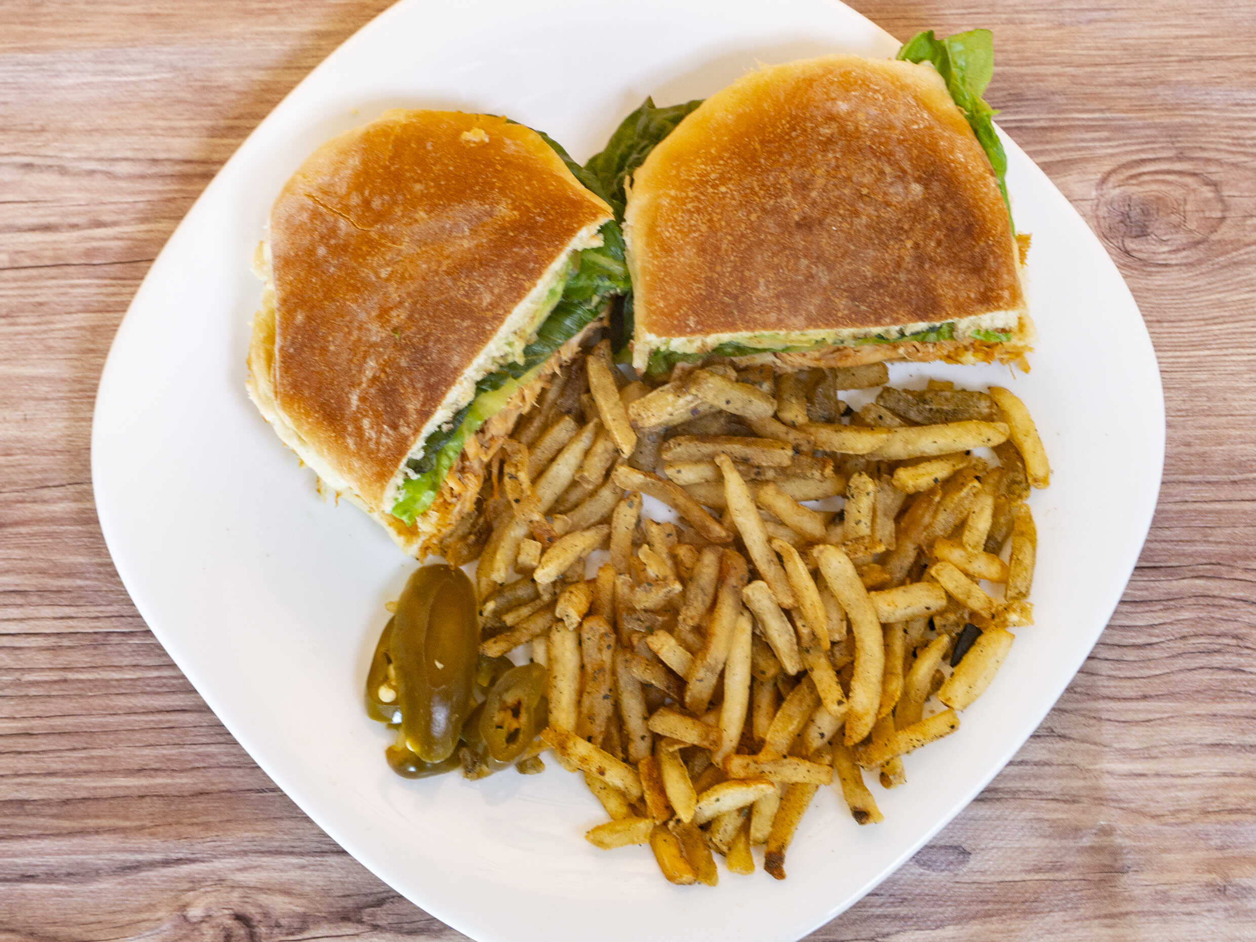 Torta preparada con lechuga, tomate, aguacate, acompañada de aderezo chipotle y jalapeños.