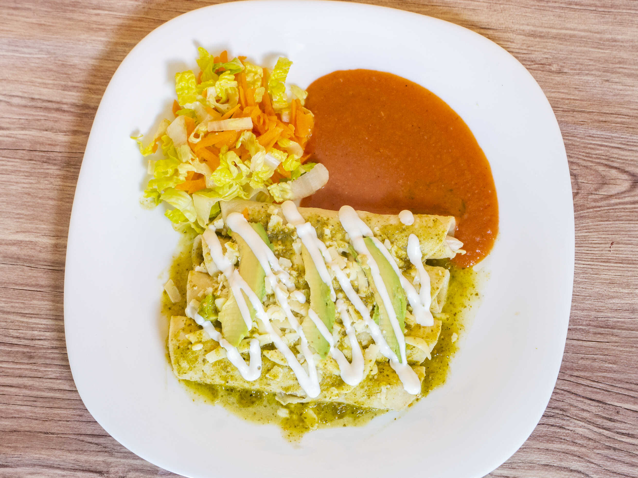 Cuatro enchiladas rellenas de pollo con aguacate encima acompañadas de frijoles de la casa y ensalada.