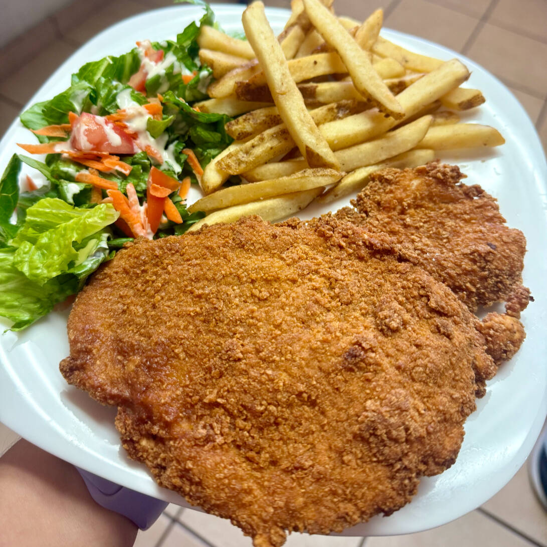 Milanesa de pollo acompañada con papas a la francesa, ensalada y tortillas de maiz