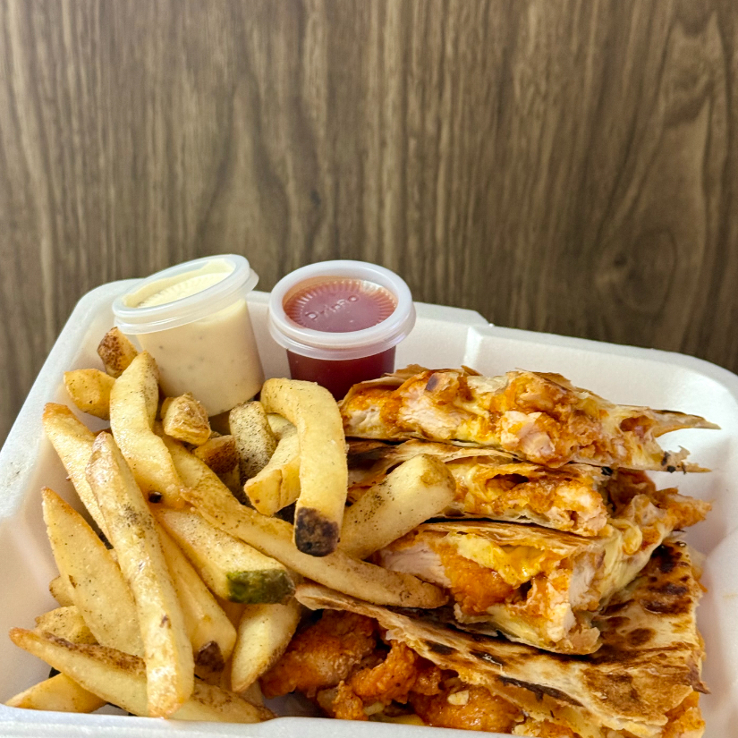 Pechuga de pollo empanizada bañada en la salsa de tu elección adentro de dos tortillas de harina con queso chihuahua, acompañada con papas a la francesa