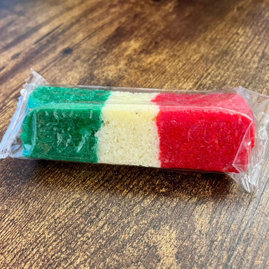 BANDERA DE DULCE DE COCO, COLORES VERDE, BLANCO Y ROJO. 80 GRS APROX.