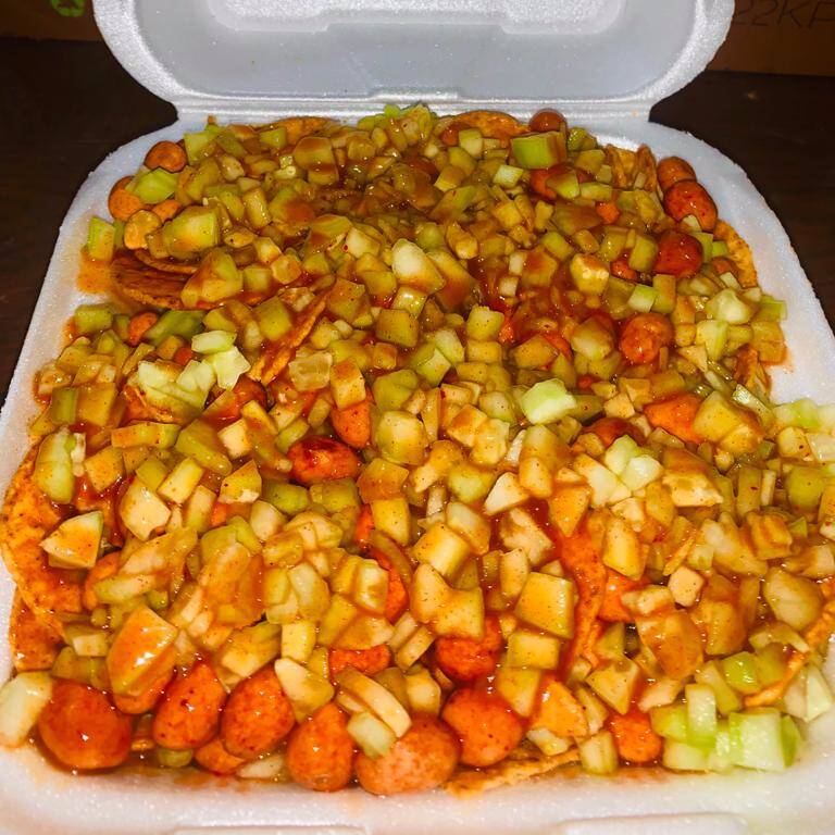 Fritos 120 grs, clamato, pepino, cacahuate, rielito, chamoy, chilemón y tajín.