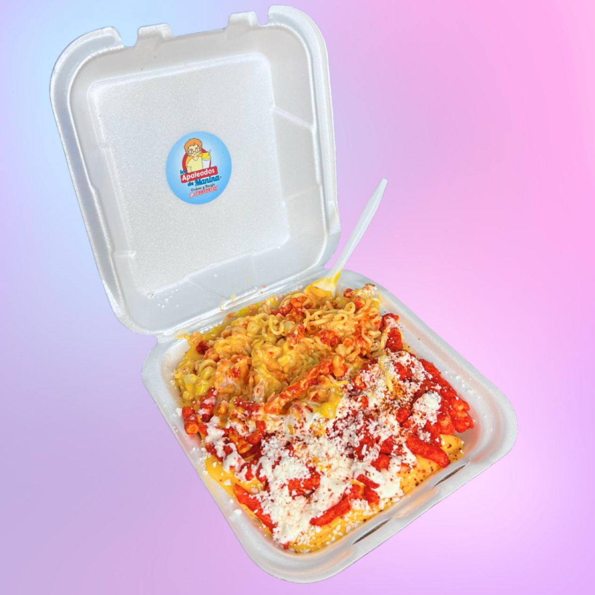MARUCHAN TIPO RAMEN, (SIN CALDO), PREPARADO CON GRANOS DE ELOTE, QUESO AMARILLO E INGREDIENTES A ESCOGER (VAN DENTRO DE LA CHAROLA). LAS SABRITAS, SALSAS Y/O LIMÓN, SE ENVIAN POR SEPARADO. (IMAGEN ILUSTRATIVA.)