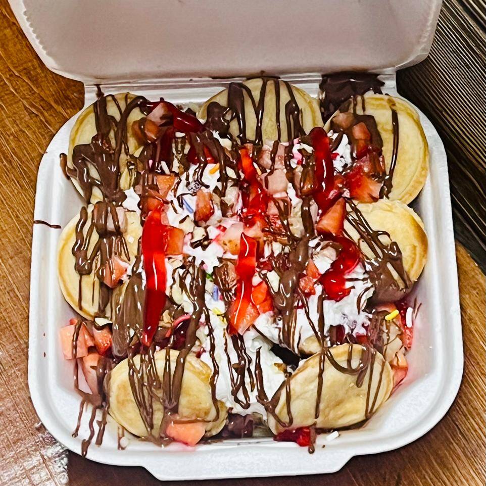 INCLUYE 15 PIEZAS DE MINI PANCAKES. ESCOGE LOS INGREDIENTES Y TOPPINGS. PERSONALIZA CON INGREDIENTES EXTRAS. REALIZA LAS MAS DELICIOSAS COMBINACIONES!!! LA ORDEN SE ENVÍA YA PREPARADA CON TODOS LOS TOPPINGS Y COBERTURAS. (IMAGEN ILUSTRATIVA)