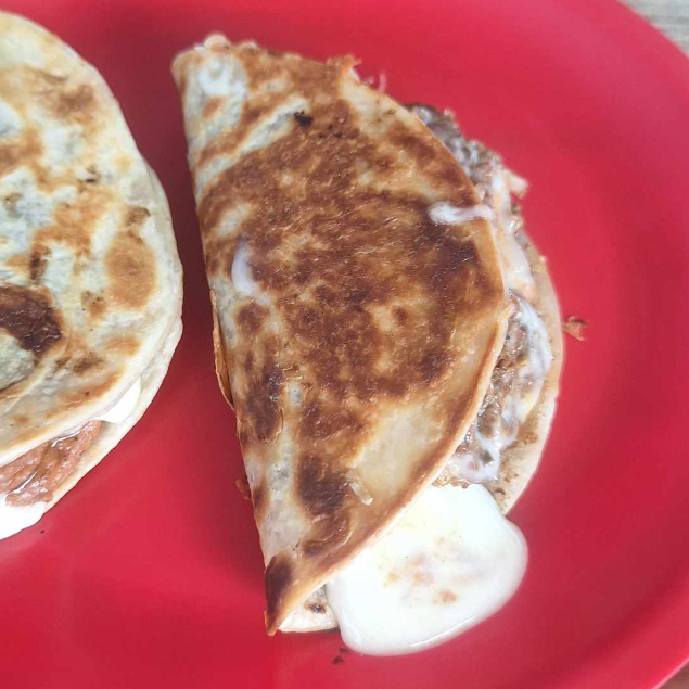 Deliciosa quesadilla doble elaborada con tortillas gorditas de harina, frijol y carne a elegir. Especialidad de la casa. Incluye jugo vichi (consomé)
