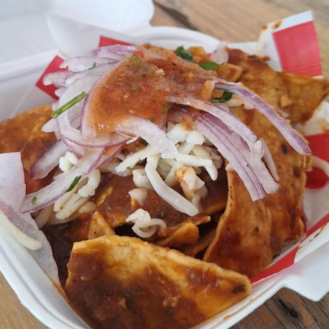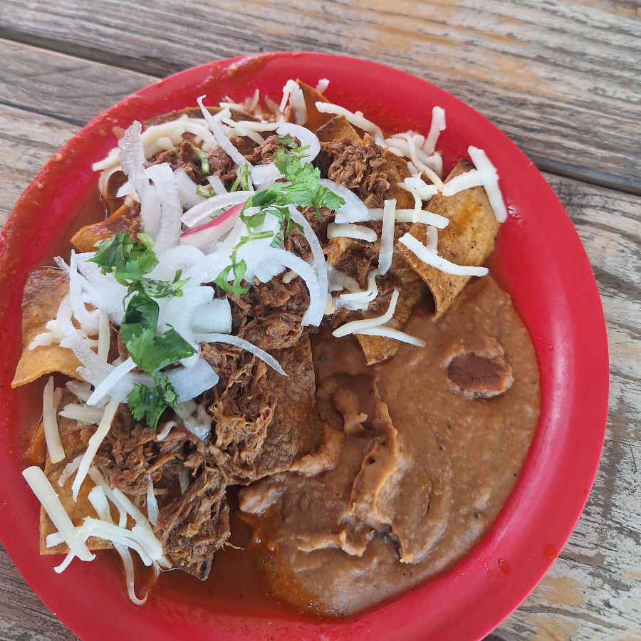 CHILAQUILES ROJOS CON QUESO, Y CARNE A ELEGIR: CABEZA, BARBACOA O CHICHARRON, ACOMPAÑADOS DE FRIJOL