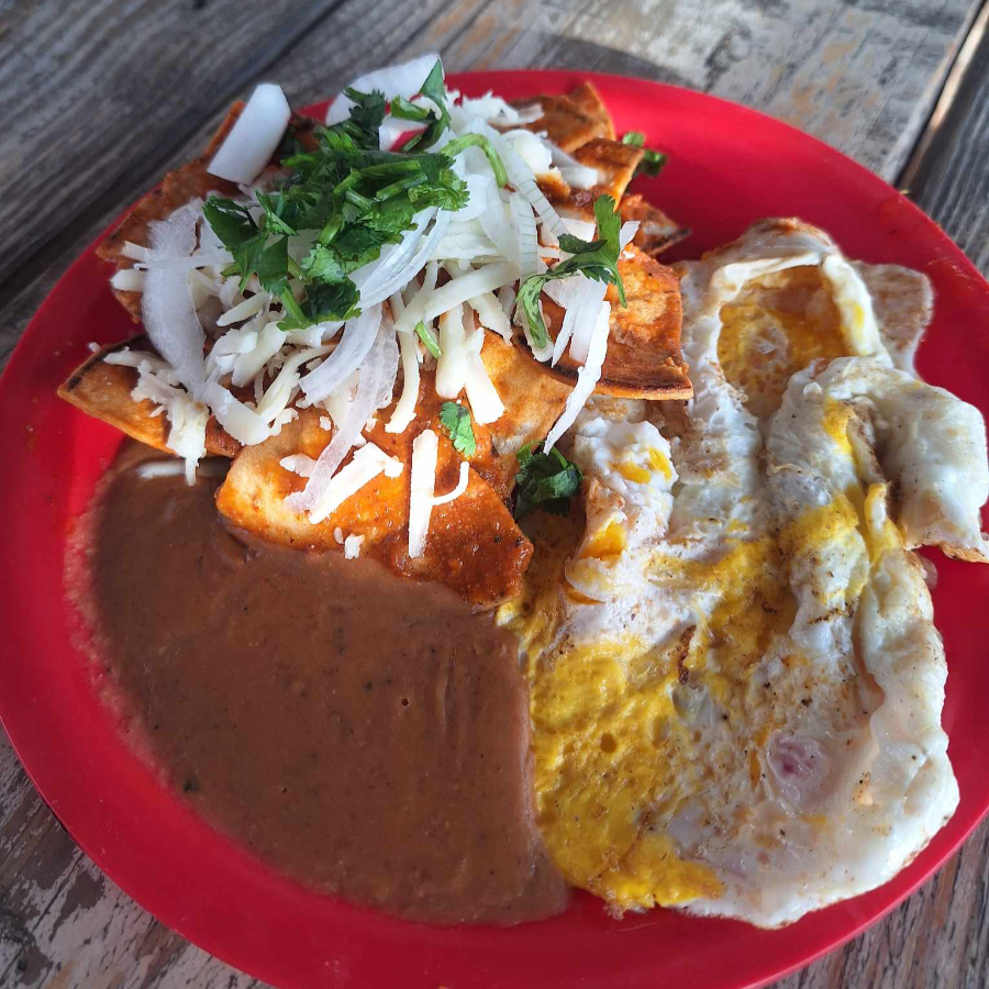 CHILAQUILES ROJOS CON QUESO, CILANTRO Y CEBOLLA, ACOMPAÑADOS DE FRIJOL
