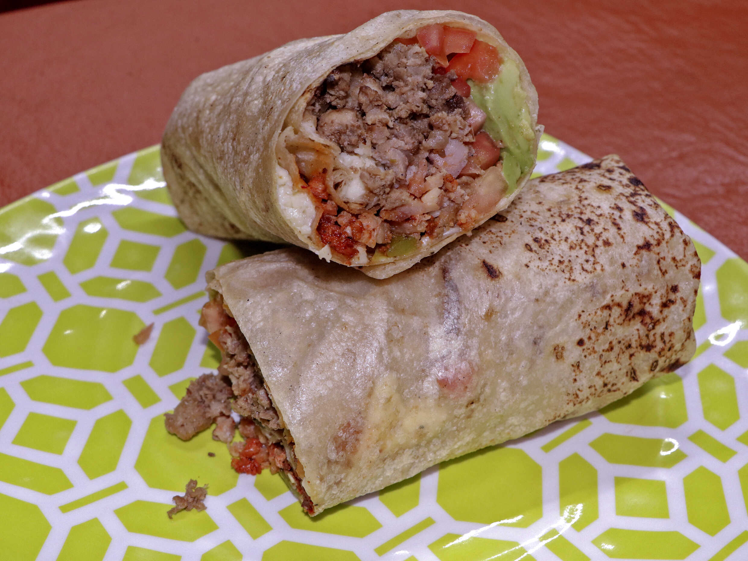 Carne a la plancha (res), tomate, aguacate, queso, tocino, chile verde tatemando.