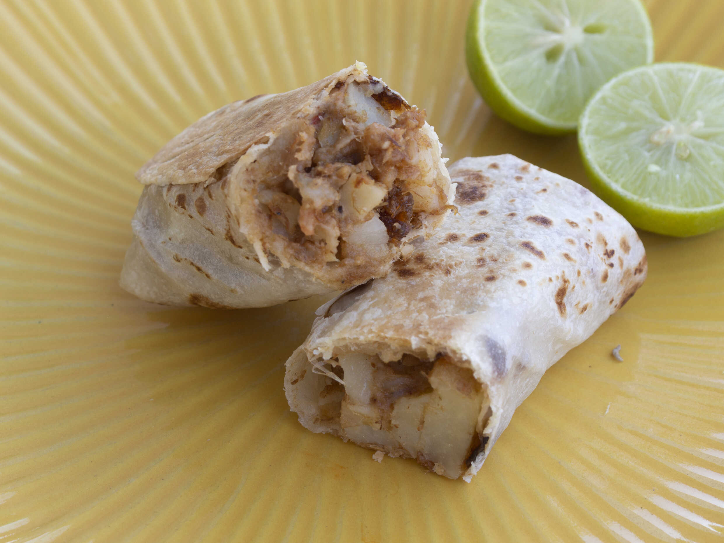 Tortilla envuelta rellena de bistec de res con papas y verdura.