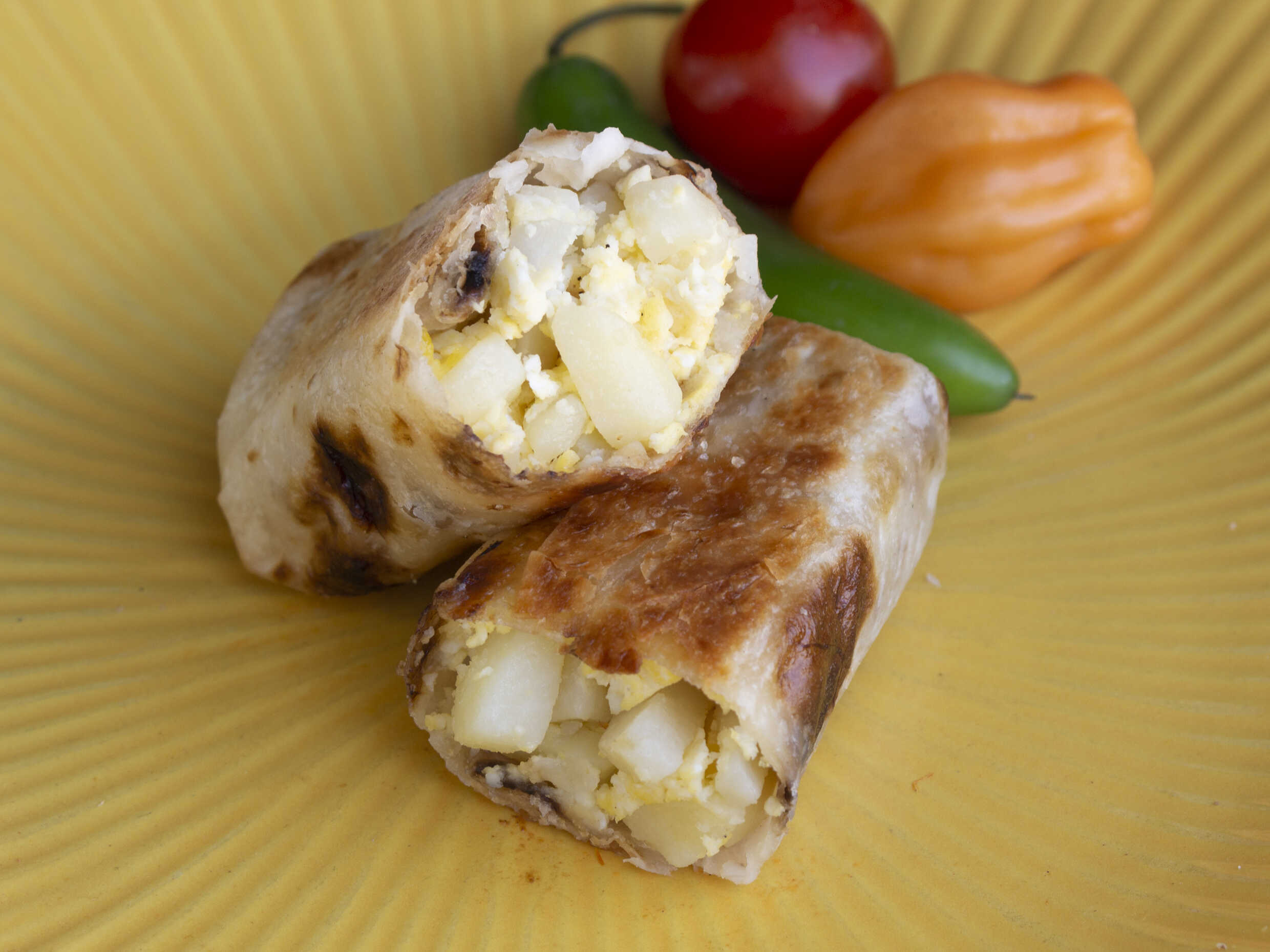 Burrito envuelto en tortilla de harina relleno huevito guisado con papas.