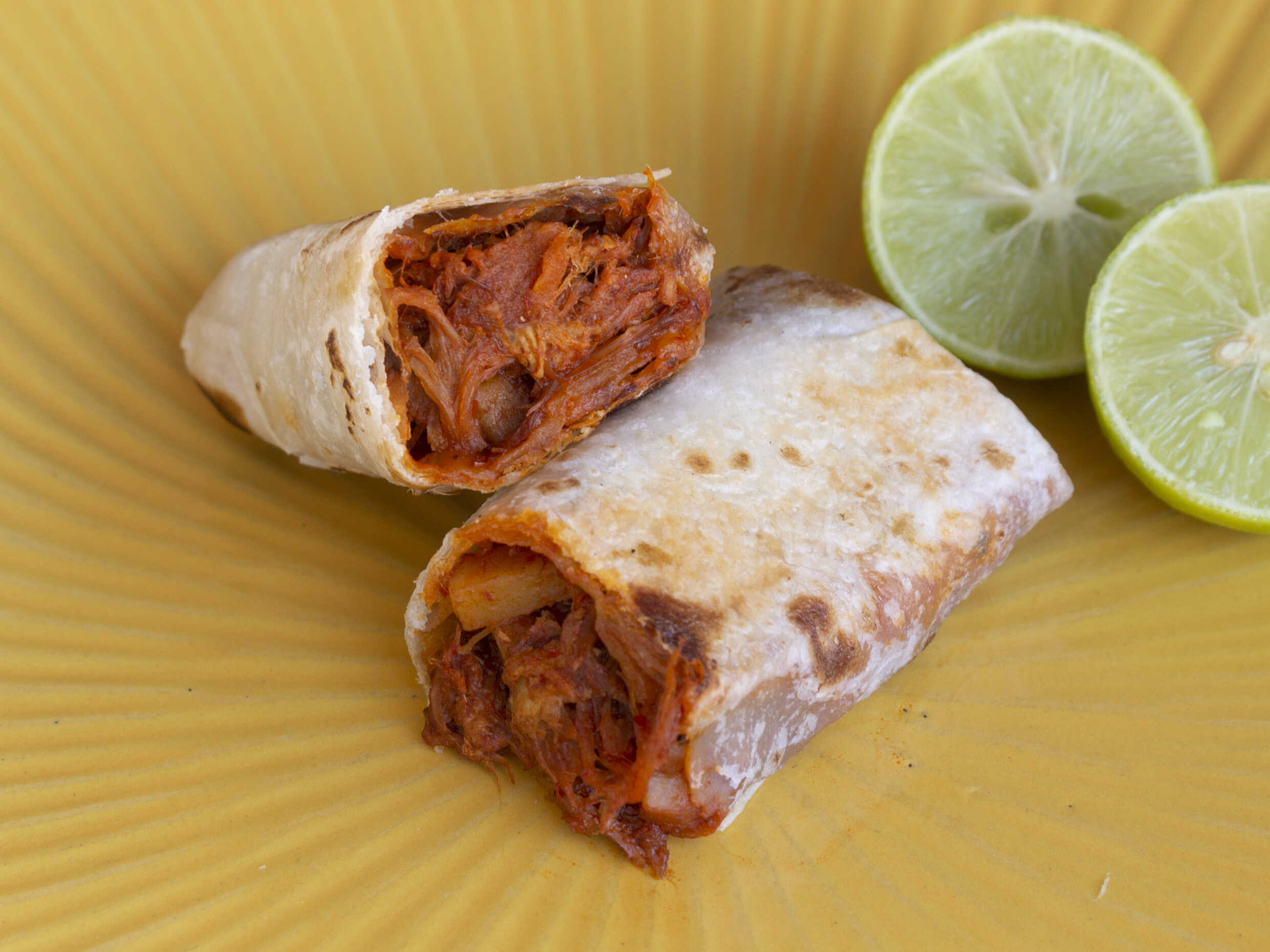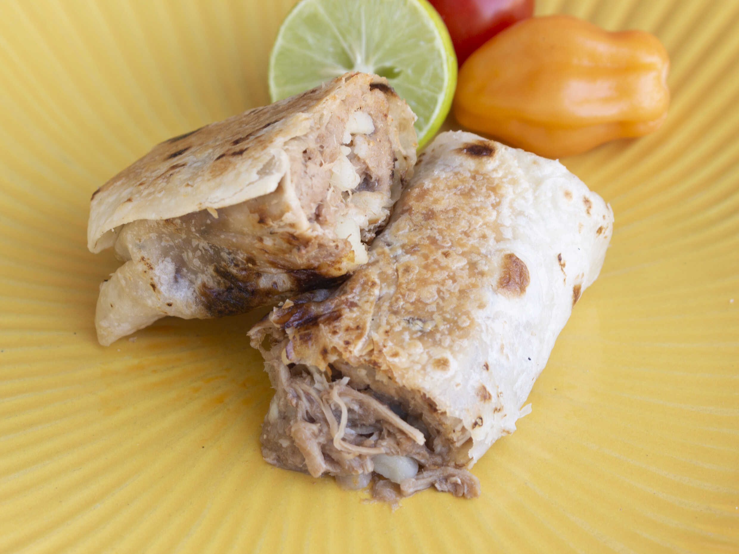 Burrito envuelto en tortilla de harina relleno chicharrón de puerco, guisado con verduras.