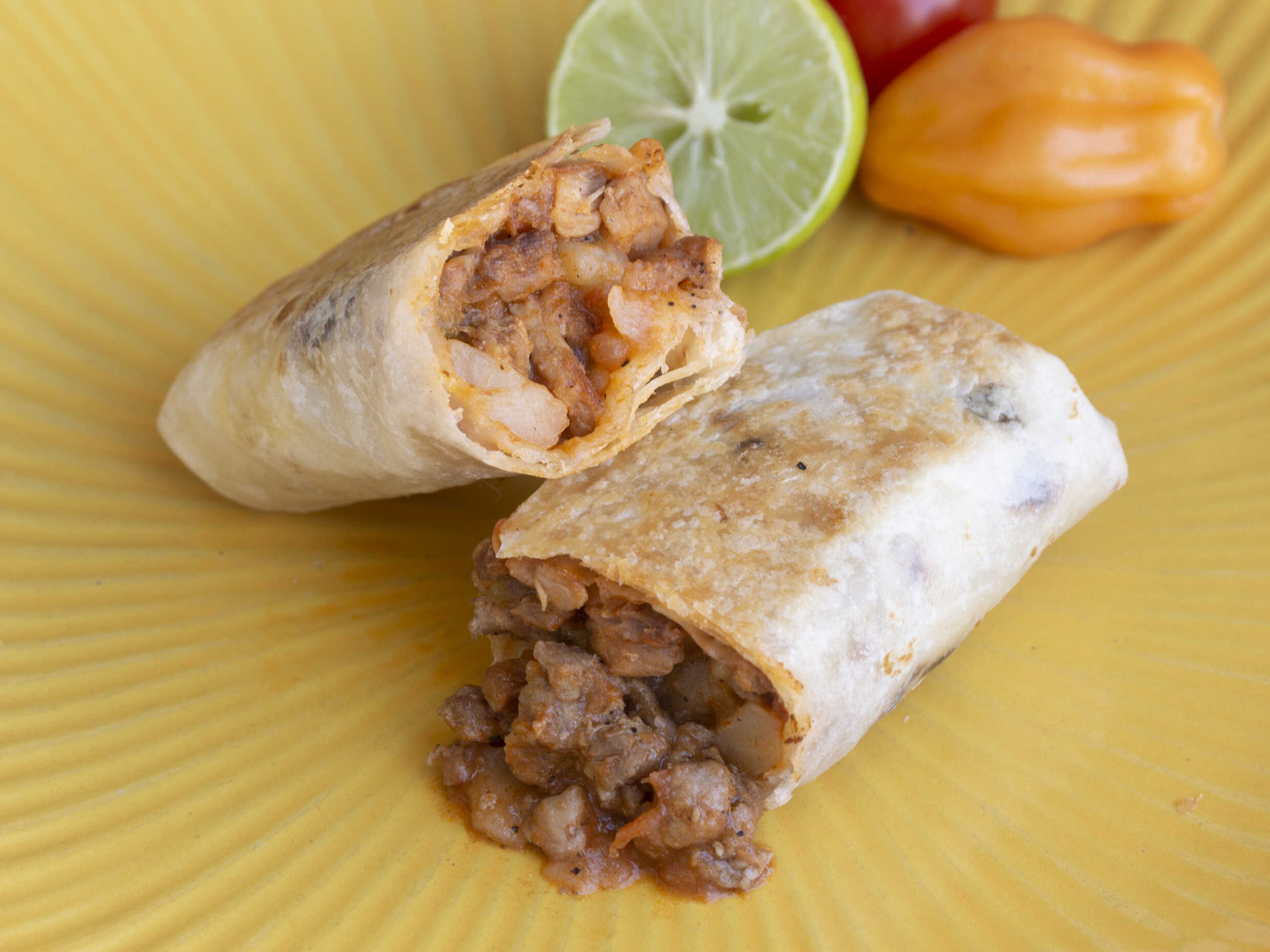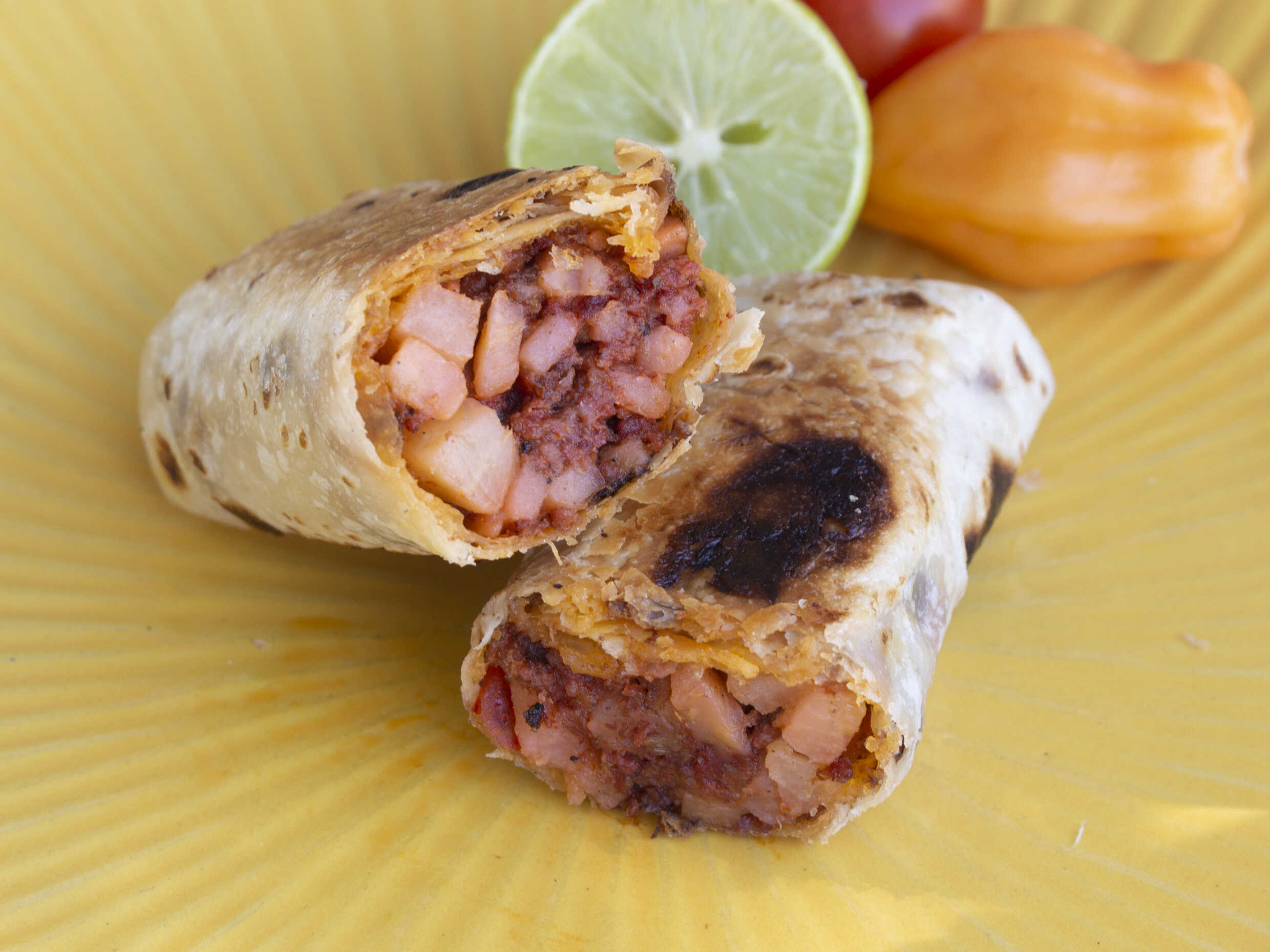 Burrito envuelto en tortilla de harina relleno de papas guisadas con chorizo de res casero.