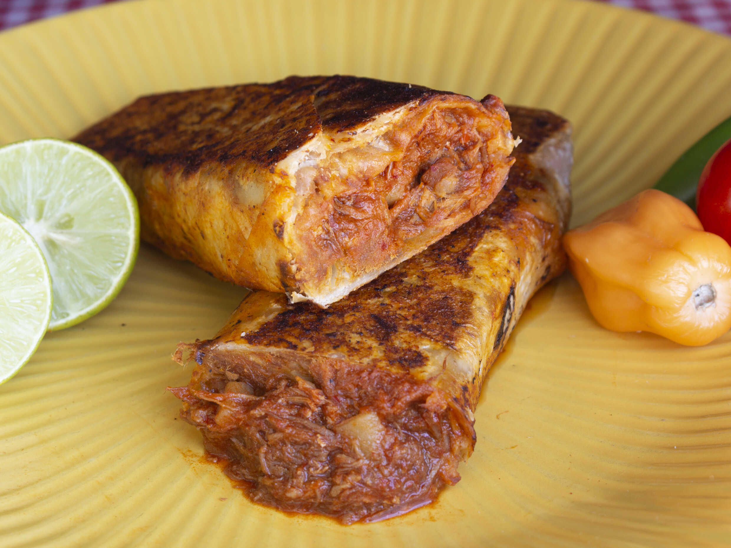 Burrito envuelto en tortilla de harina relleno de carne de res con chile.