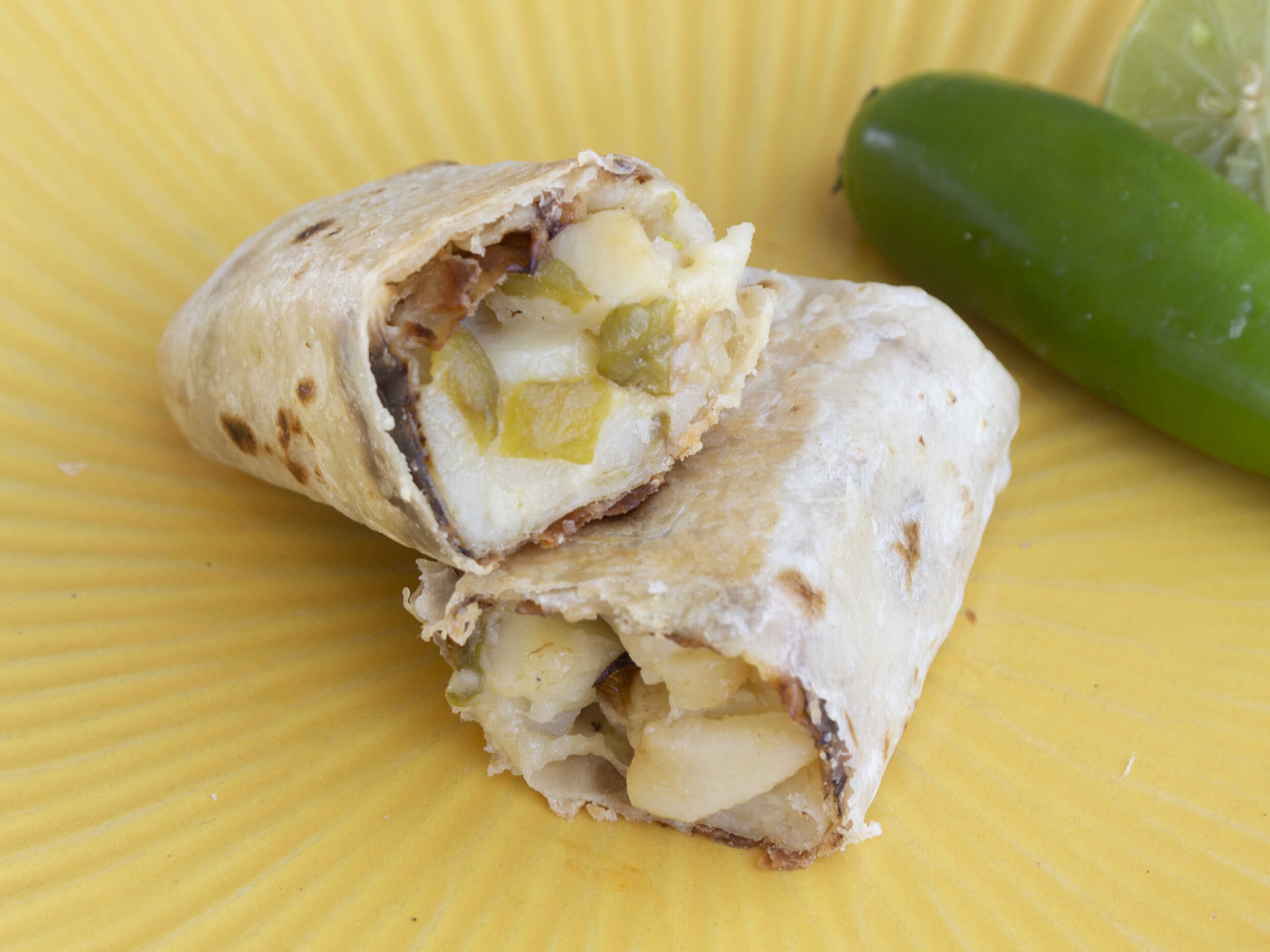 Burrito envuelto en tortilla de harina relleno de papas guisadas con chile verde y queso gratinado.