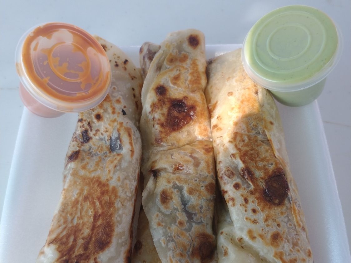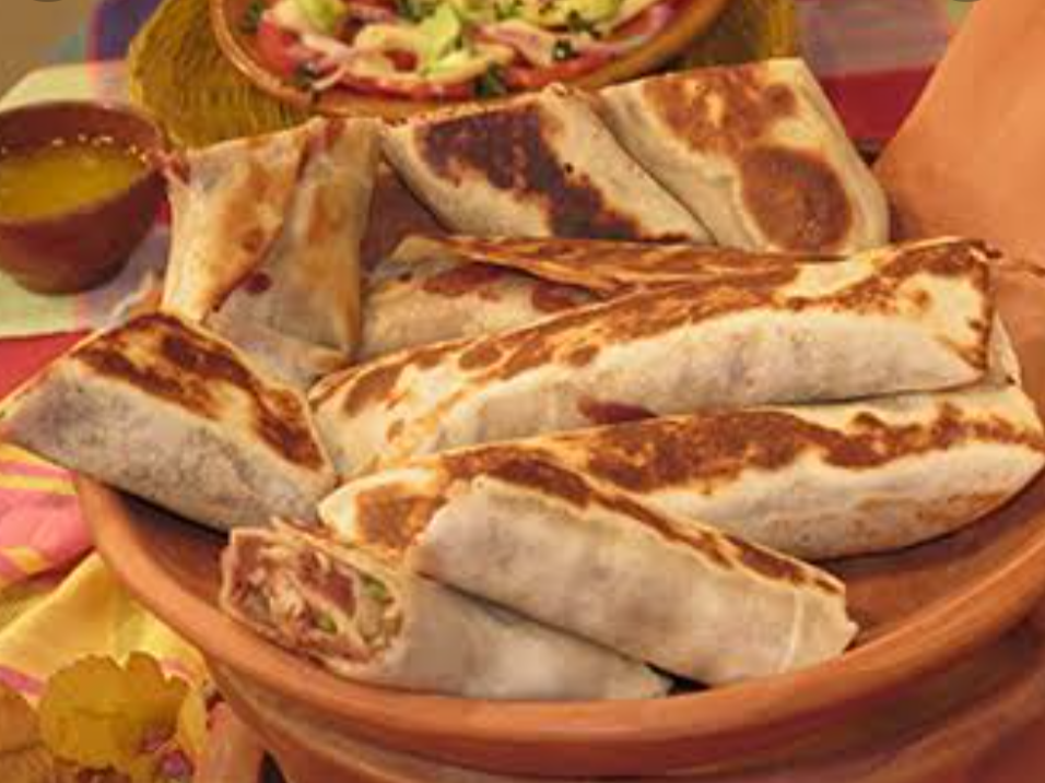 BURRO EXTRA GRANDE ENVUELTO CON DOS TORTILLAS DE MESA EMPALMADAS, EMBARRADA DE FRIJOLES Y RELLENO DE CARNE CON CHILE, BAÑADO POR FUERA POR LOS JUGOS DE LA CARNE CON CHILE Y DORADO Y AHUMADO, BIEN SABROSO
