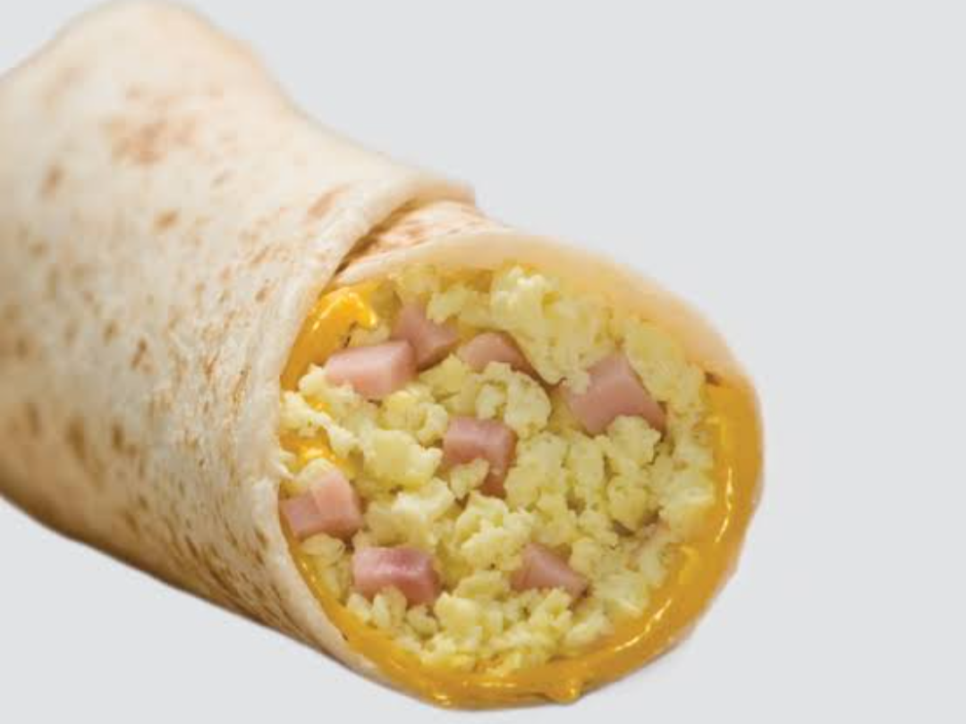 Burrito envuelto en tortilla de harina relleno huevito guisado con jamón de pavo.
