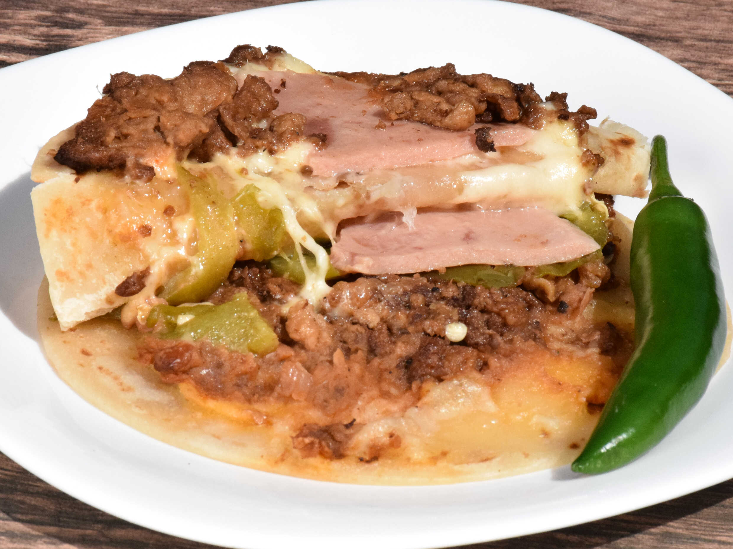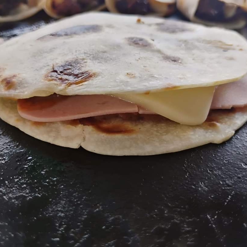 Doble tortilla gordita con queso asadero, jamón, chicharrón y frijolitos