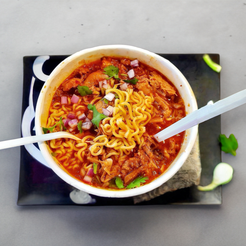 Ramen con caldo de birria, carne, verduras y salsas.