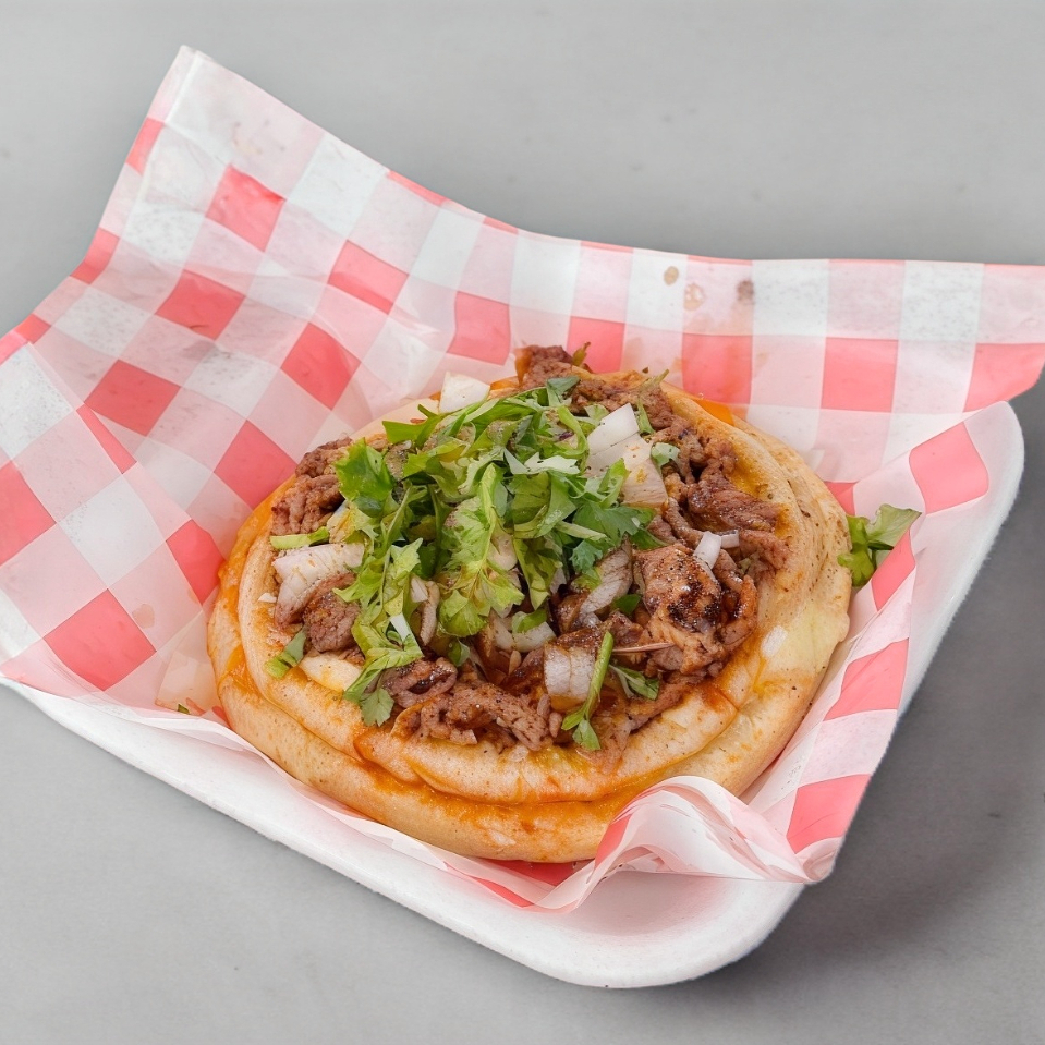 Pellizcada con asientos, queso, birria de res, cebolla y cilantro.