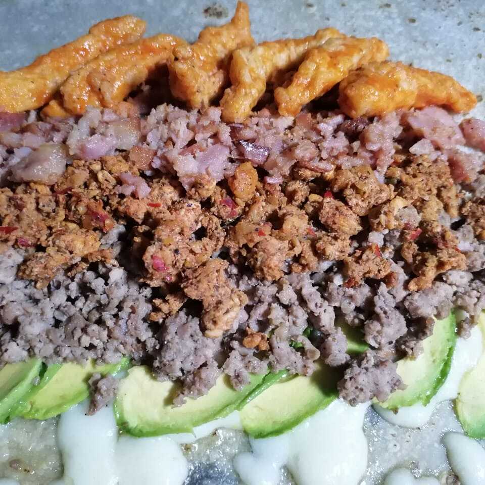 Tostitos mezclados con Res, Adobada y Boneless, aguacate, tomate, chile verde y queso menonita