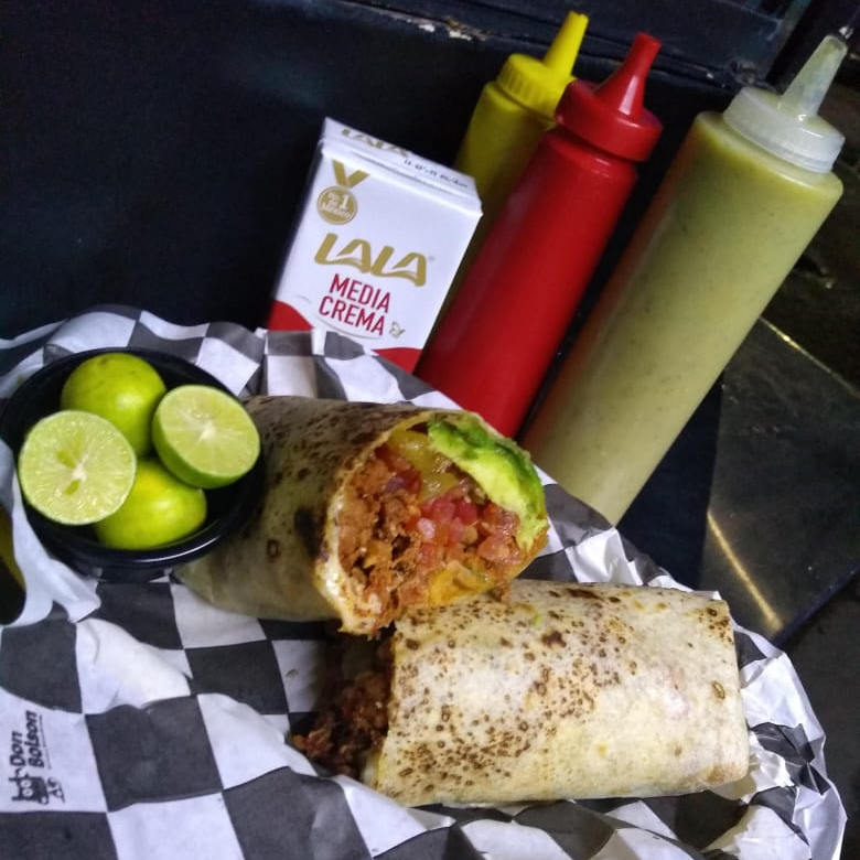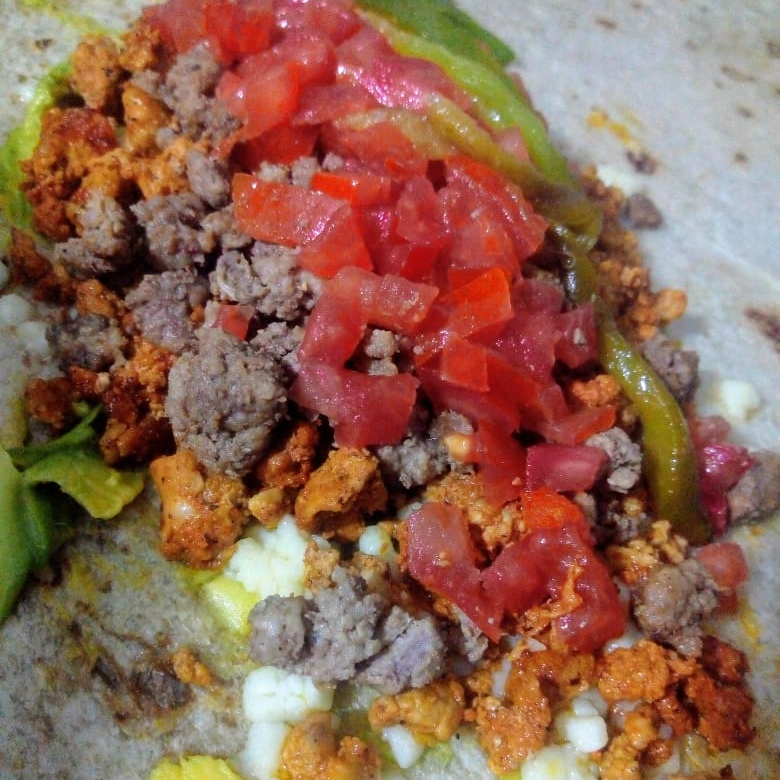 Combinación de res y adobada, mayonesa, aguacate, tomate, chile verde y queso menonita.