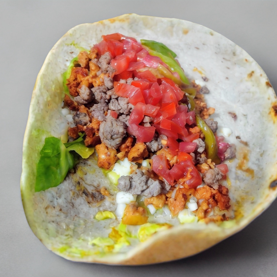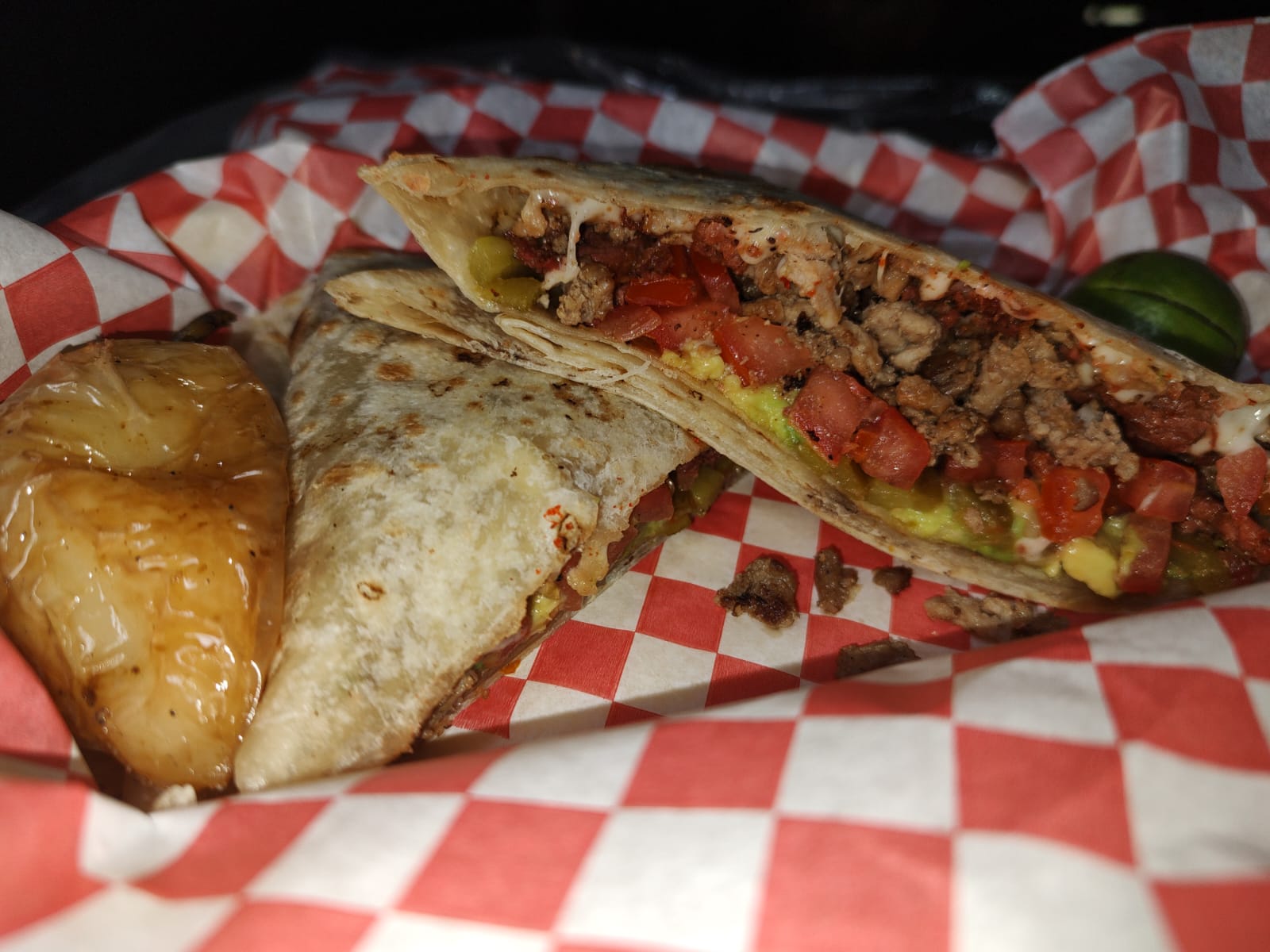 Quesadilla formada con tortilla de burro, Res y Adobada, aguacate, tomate, chile verde y queso menonita