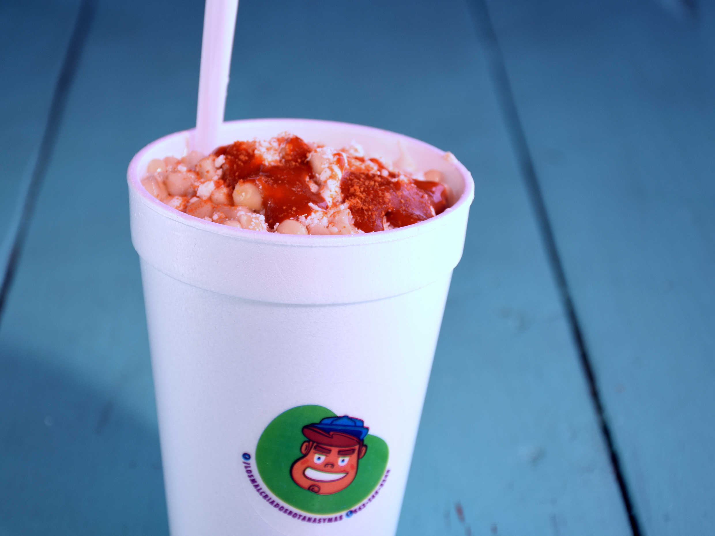 Coctel de elote 12 onzas preparado con mantequilla, media crema y queso cotija acompa;ado de salsas y limon