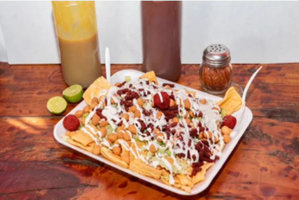 Frituras a elegir con repollo, pepino, media crema, queso cotija, salsas y limon.