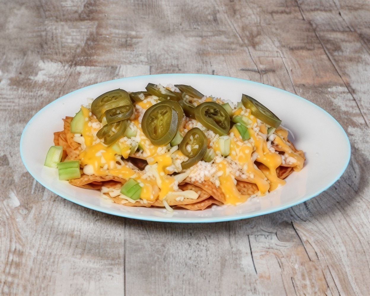 Tostinachos, queso amarillo, queso cotija y jalapeño