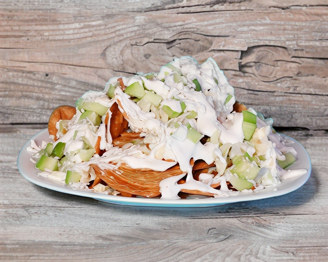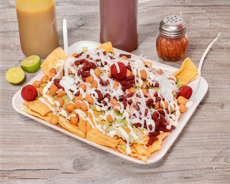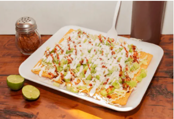 Frituras a elegir con repollo, pepino, media crema, queso cotija, salsas y limon.