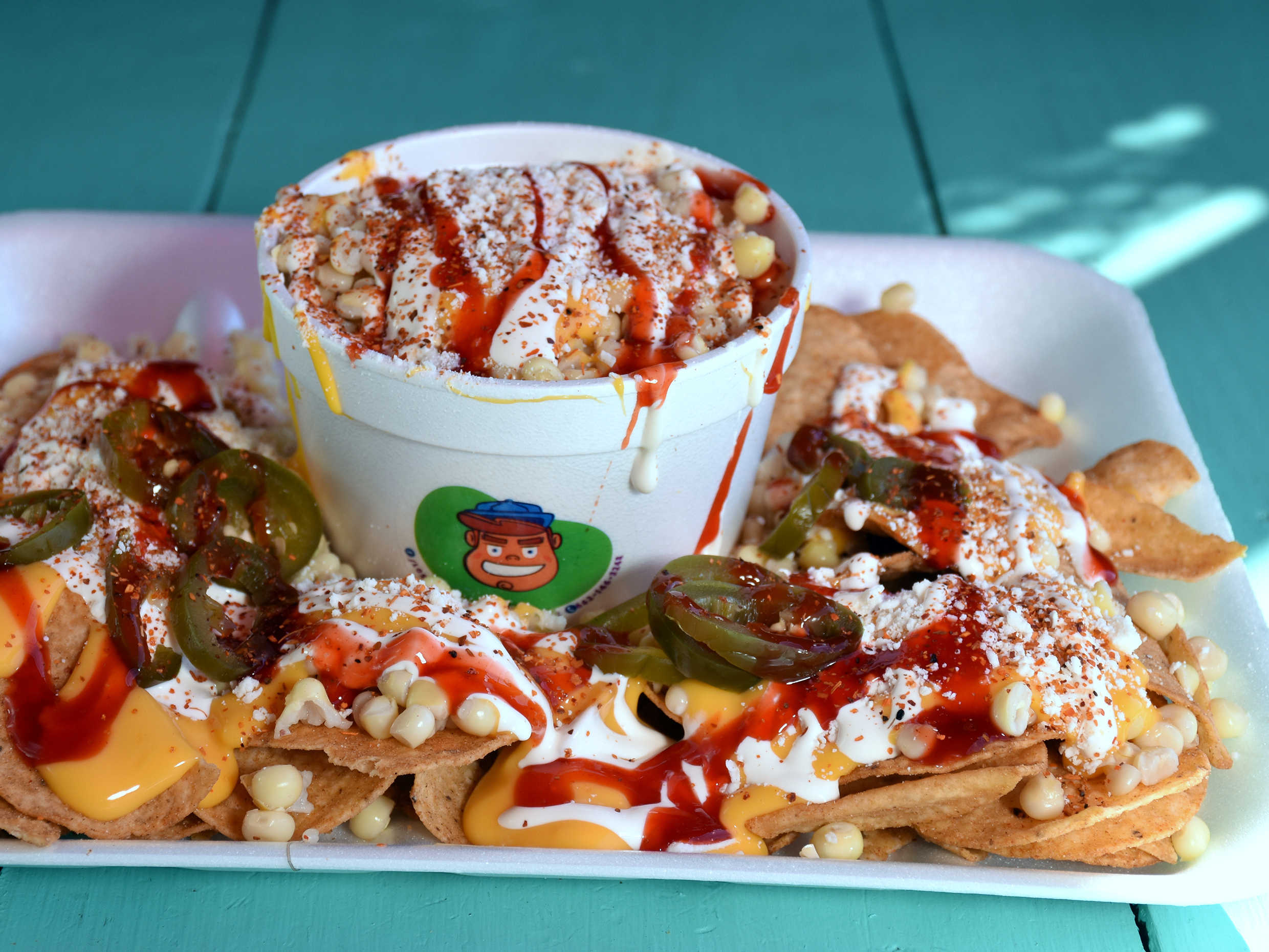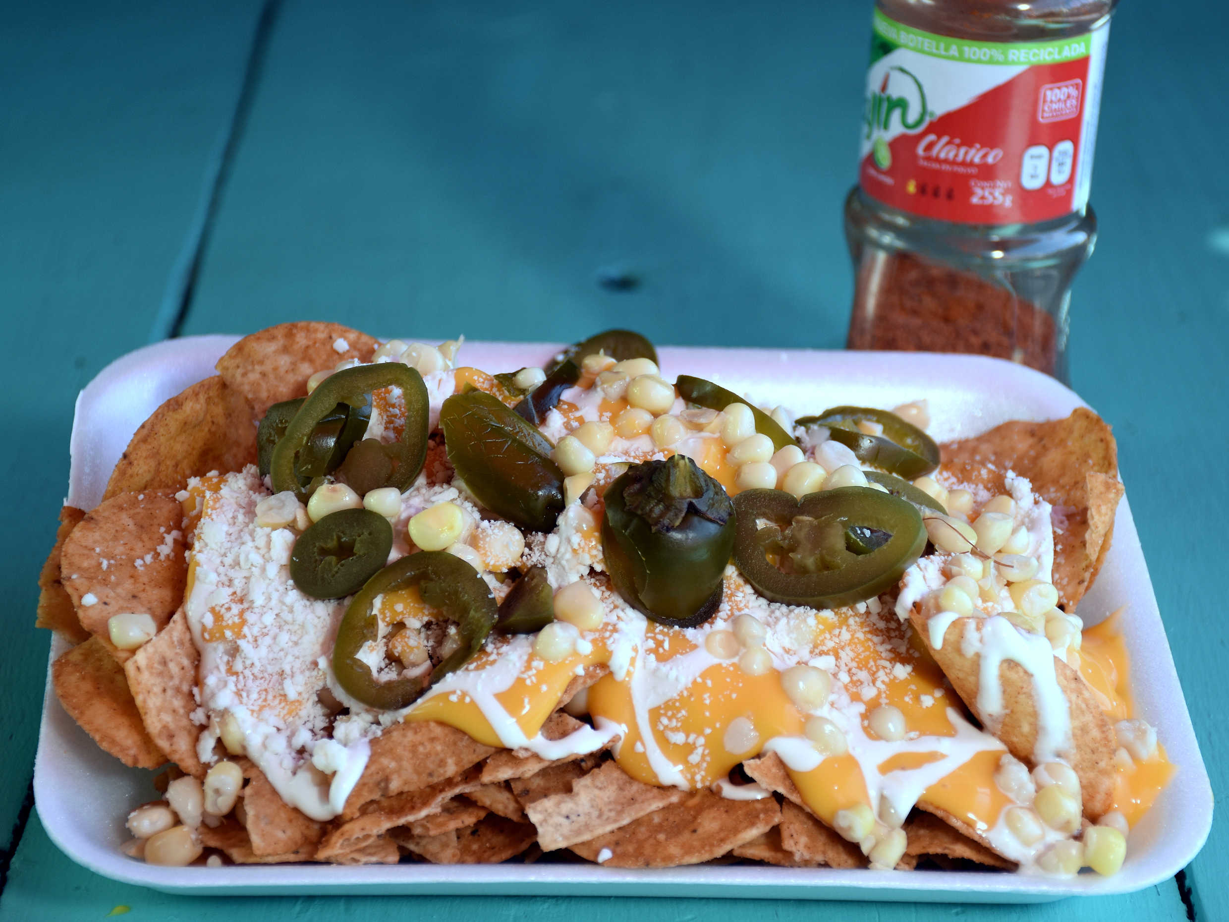 Sabritas con elote, queso amarillo, queso cotija, jalapeño y salsas.