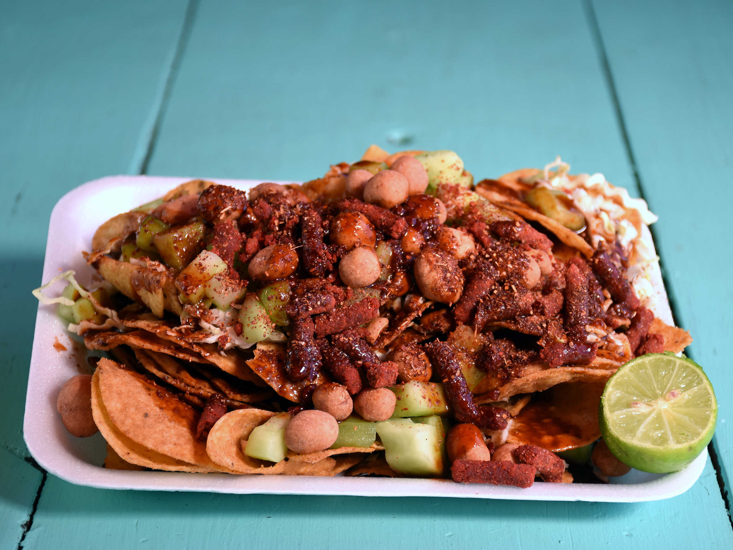 Frituras repollo, pepino, cacahuate, rielito, dulces diablitos, media crema, queso cotija, salsas y limon